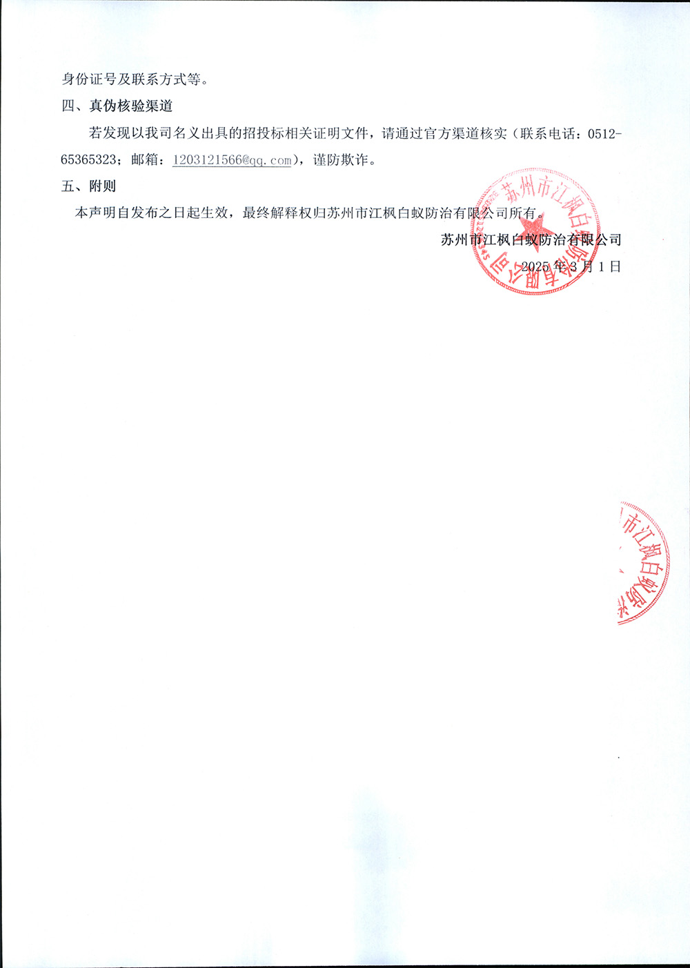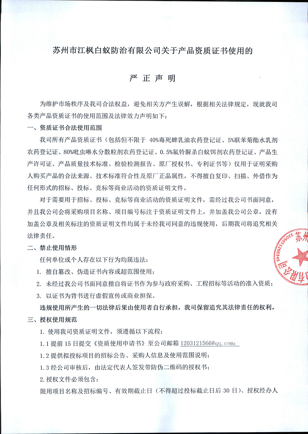 苏州市江枫白蚁防治有限公司关于产品资质证书使用的严正声明
